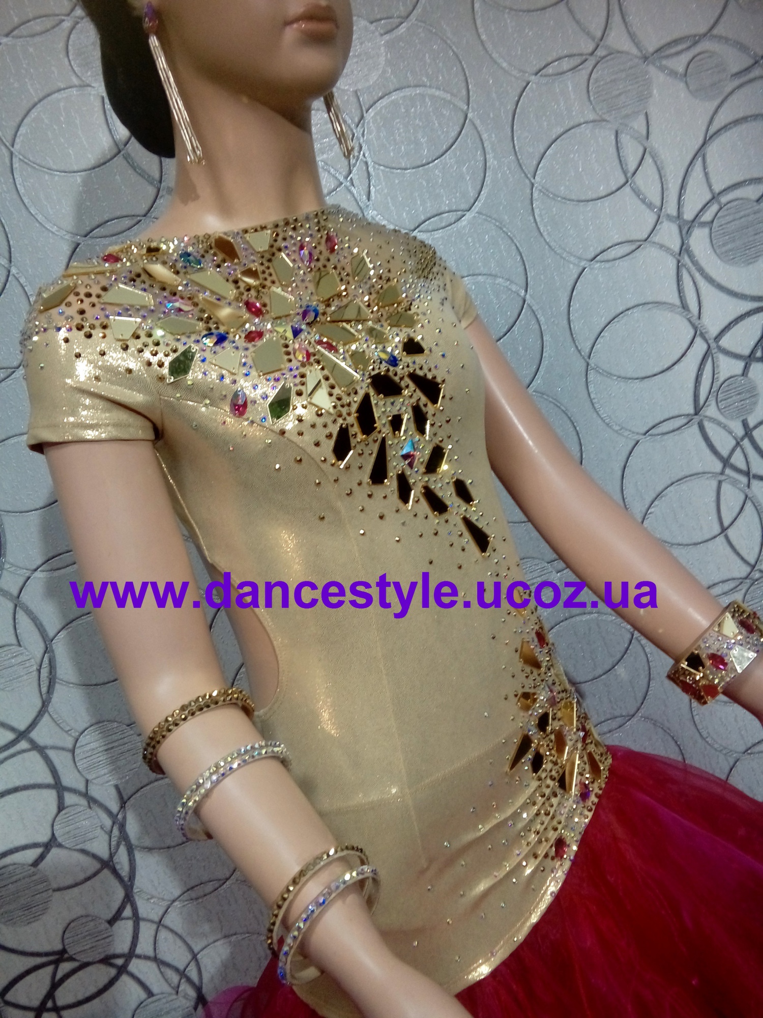 Золотая латина с зеркалами. Бифлекс "золотой песок", органза и много много страз, зеркал. Пока расклеила да пришила все, думала ослепну, два дня ничего шить не могла. Манекен на парочку размеров меньше нужного и в росте.. примерно на 15см девочка выше.