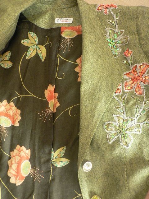 Amanta Opus Опубликовано 15 мая, 2009 Поделиться #677 Опубликовано 15 мая, 2009 Показываю, как довольно быстро (за вечерок) можно сделать "лживую" вышивку. Если бывают лживые грибы, то вышивка тоже может быть таковой:)Хотя, усердства требует и навыка, да и любовь к ручной работе тоже не помешает,т.к. вышитый мотив готовый, это шёлк вышитый, но Я то его весь продублировала по ткани, каждую пайеточку, затем лишнее в виде основного шёлка, отсекла.Костюм брючный, льняной, не дублирую клеевыми, только чуть совсем очень тонкой клеевой (итальянской) по краю косого среза верхнего воротничка и по борту узкую полосочку для петель и пуговичек, которые в золотой "упряжке" (кстати, покрытых эмалью). Отстрочен костюм нитками (фиг знает какими:) блестящими, может они для вязания были, не знаю, главное, что подошли:))в тон пуговкам. Подкладочная ткань (шёлк с хлопком фифти-фифти) по цветовой гамме очень спелась с вышивкой и костюмчиком. Зелёное с оранжево-лососевым - задорное сочетание:) Ссылка на сообщение Поделиться на другие сайты Поделиться