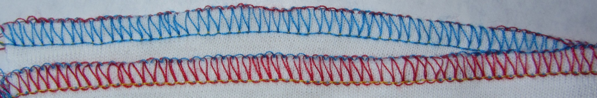 Две самые верхние строчки, точнее одна (вид с лица и изнанки). Чуть ослабить нижний петлитель. Он перетягивает верхнюю/синюю нить на себя и вытягивает на изнанку нить иглы/желтую. Нож у меня без цифр, просто "барашек" и обозначения W <--> N, поэтому чисто на глаз поворачиваю.