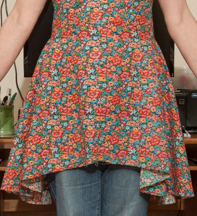 получилось не очень сладко - впереди складок, как и положено, получилось предостаточно, что и вышло в моём платье в горошек, а т.к. длина нижней окружности получилась за 2м, да ещё длина юбки 70 - бочонок скукошился:-)