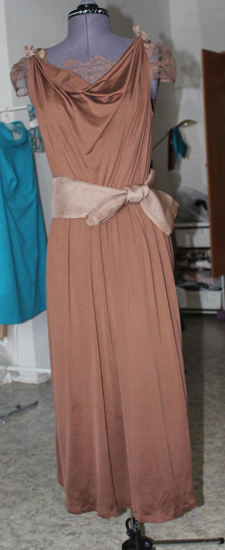 из поста 31 января: "ткань очень лёгкая, тонкая (почти шифон), непрозрачная, бархатистая. Не вытягивается, не скользит. Цвет не с рыжеватым тоном, как на фото, а с розоватым. Выглядит дорого, в работе сложным не будет. То платье, что я задумала, шить можно, и даже усилить нотку винтажности от первоначальной задумки. Теперь всё будет зависеть от компаньона, найду ли."