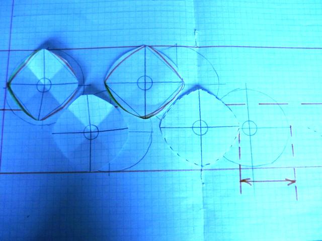 Здесь на схеме видно, что раскладывается 5 кругов по лекалу вместо 4 обычных, соответственно достаточно места для 16 по лекалу в 13 обычных, если мне надо 82 см на один - то как минимум 1, 65 м экономим. Вся остальная экономия на полусолнцах: если мне надо 3 юбки по 1,5 солнца, я покупаю только 8 м ткани вместо 10 м, и т.д., - в раскладке 5 полусолнц по лекалу вместо 4. Опять же, под органзу мое лекало еще более срезано, - но это уже практическая сторона дела, в теории я все изложила, надеюсь...