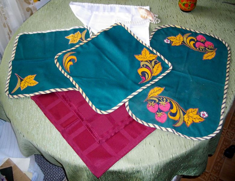 Vetag Опубликовано 8 ноября, 2013 Автор Поделиться #19 Опубликовано 8 ноября, 2013 (изменено) Может кому идейка пригодится:салфеточки для дома методом апликации.(есть и скатерть с оборкой и апликацией в тон салфеткам,но она сейчас в действии в не очень доступном месте)Просто на тряпочку выложена вырезанная фигурная картинка из другой тряпочки и нашита частым зиг-загом на машинке. По краю салфетки кант по косой.Салфетки однотонные выложила,чтобы показать шов подгибки на углах.Смотрится идеально , делается просто. Такой апликацией с таким рисунком одной бабульке делала шторы, скатерть и прихватки (12 шт) в одном стиле.Правда основа была - рогожка.Красиво получилось. Изменено 8 ноября, 2013 пользователем Vetag Моя основная тема на Сезоне Мой блог "Лебединая песня реконструктора" Мой блог "Маленькие хитрости портняжного ремесла." Ссылка на сообщение Поделиться на другие сайты Поделиться