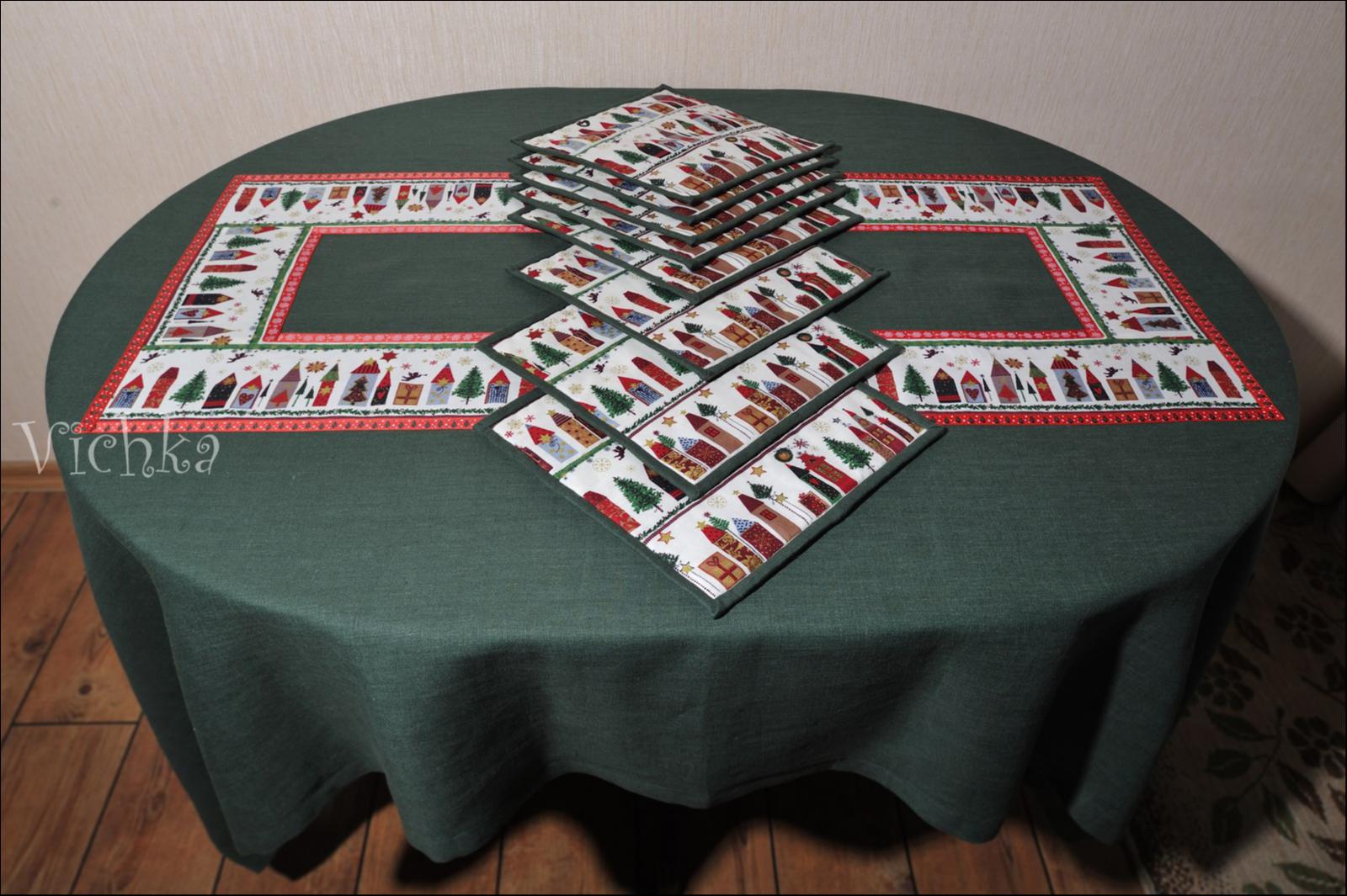 Льняная скатерть с имитацией дорожки по центру и восемь ланч-матов. Фотографировала на своем столе, но у клиентки прямоугольный стол, поэтому у нее смотрится намного лучше :)