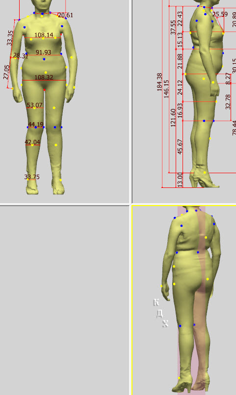 arhimed Опубликовано 20 сентября, 2018 Автор Поделиться #893 Опубликовано 20 сентября, 2018 не могу понять, откуда Архимед достаёт эти новые точки, как факир из одного места:)Точки, которые не смогли найти свои координаты обычно "сидят" по центру фигуры (внуртри меша их не видно). Ткнув мышкой в середину и потянув в сторону точка вытаскивается. Далее смотрим в командную строку (что же вытащилось) и в соответствии с номером и именем передвигаем в нужное место (теперь уже поповерхности).Кроме точки пупка, выступающего живота и точки под грудью (которые обычно не очень важны) там могут "потерятся" очень нужные точки (например точка руки), без правильного положения которых манекен не создается. По поводу сохраненного обжика без головы и с руками (без ладошек).Это поверхность, которую создает Лукстейлор по вашему скану, уже облагороженную и симметричную. Типа облипки.По этой поверхности вы можете сделать свой личный реальный менекен для реальной примерки... или как хотите.Но импортировать его обратно в Лукстейлор будет не правильно.Такая поверхность не подходит ни под какой тип. Чтобы он стал нуде - надо обрезать руки и т.д. ...Чтобы превратился в скан - надо прицепить голову :) Ссылка на сообщение Поделиться на другие сайты Поделиться