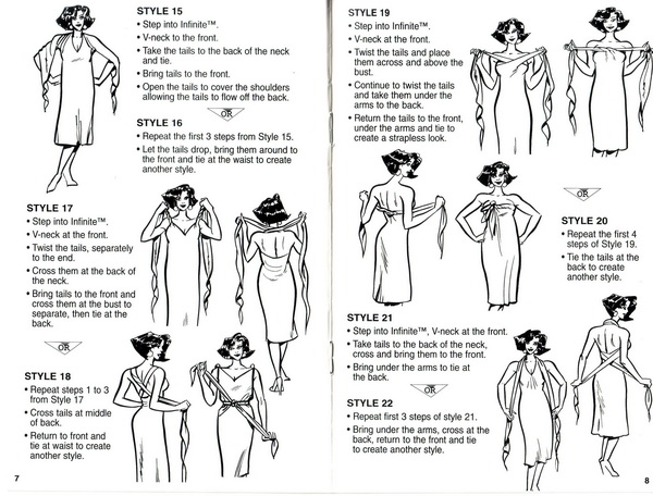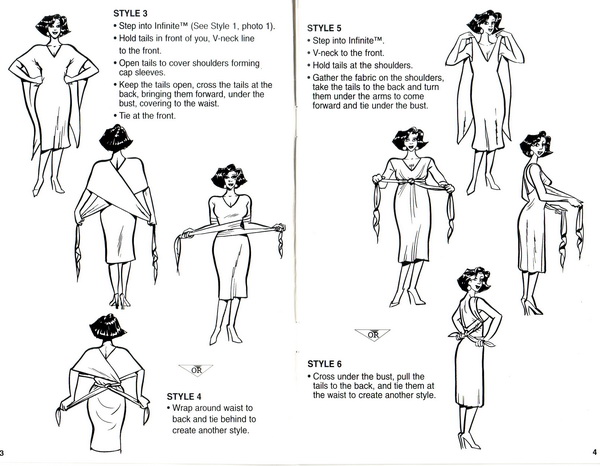 S.Mart Опубликовано 27 ноября, 2008 Поделиться #58 Опубликовано 27 ноября, 2008 Форумчанка S.Mart любезно поделилась с нами материалами, касающимися оригинального платья. Сама она является счастливой обладательницей "INFINITE DRESS". (Так оно называется). Черного цвета, оно было подарено хозяйке ко дню рождения 8 лет тому назад.Надеюсь сканы окажутся полезными для настоящих и будущих обладательниц этого поистине чудесного платья пригодного на все случаи жизни.в дополнение информации от S.Mart о платье хочу добавить еще несколько слов. Прежде всего, это платье нужно носить бюстгалтером без бретелек, тогда количество вариантов увеличивается во много раз. Во-вторых можно варьировать со множеством аксессуаров, а именно:- шарфы в тон платью или контрастных цветов на плечи или талию, броши крупные на перед или на плече, - косынки/платки большие и различных цветов на шею или пояс, - крупная цепь золотая на шею, тогда можно варьировать свободными концами платья, выпуская их наперед или назад и последнеее немоловажное - платье это можно носить с пиджаком делового стиля. Длину платья можно изменить от мини до макси. Достигается это путем опускания концов платья, углубляя вырез спереди или ,наоборот,поднамая концы выше, а также, если зафиксировать талию концами платья то юбку можно поднять и сделать напуск лифа. Как видно, название этого платья вполне оправдано, "INFINITE" - масса, множество. Имея только одно платье получаем бесконечное множество вариантов. Можно смело каждому импровизировать на свой вкус и желание. Кроме этого , платье подходит почти на все фигуры и размеры от 2 до 20. Платье выпускалось фирмой трех цветов : Черного, красного и голубого. Мое платье размер 16-18, черное. Материал - полиэстер 92%,эластан 8% . Сделано в Канаде в 2000 году. И несколько слов от производителя Это платье, которое превращается от консервативного до элегантного, от дневного до вечернего - следует только изменить косметику и освежить прическу и аксессуары. Это платье прекрасно для путешествий, оно не трубует глажки и легко стирается....Оно легкого веса и легко пакуется в сумку...Сочетается со скромным, деловым или вечерним жакетом...или купальником! Платье может носиться с или без бюстгалтера. Кадрен, благодарю за оказанную помощь поместить картинки о платье в теме . Sew smarter every day ! Ссылка на сообщение Поделиться на другие сайты Поделиться