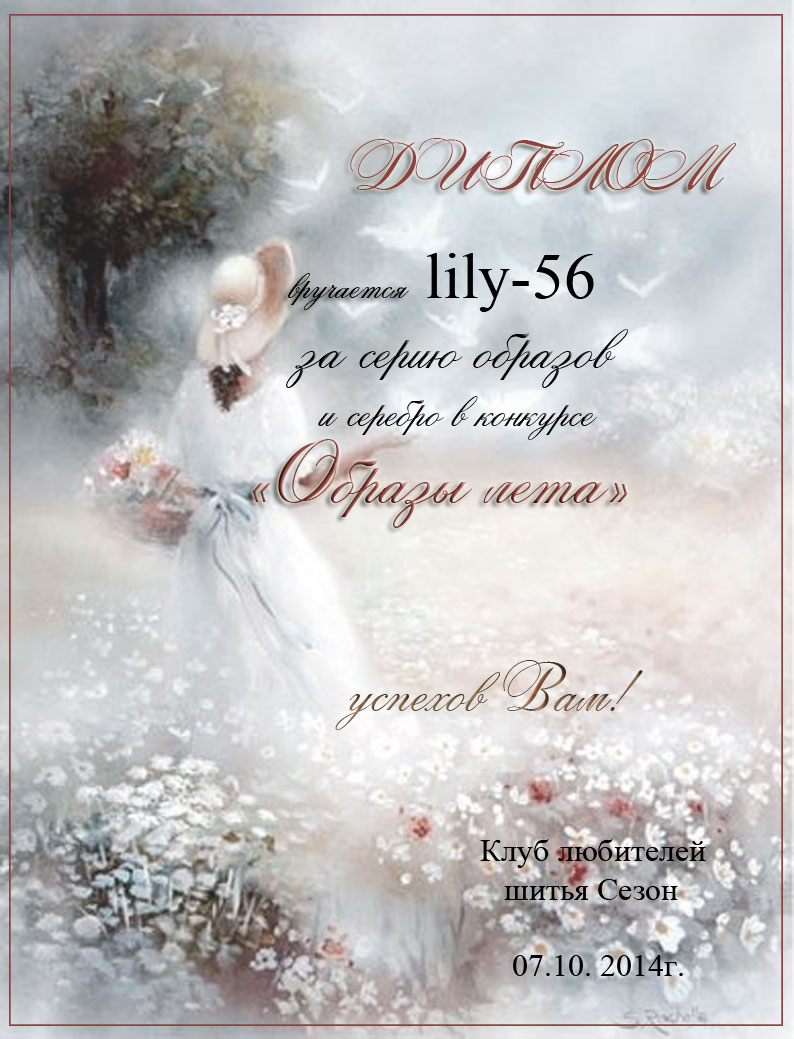 lily-56 Опубликовано 12 октября, 2014 Автор Поделиться #170 Опубликовано 12 октября, 2014 Всем доброго дня!Ну во первых хочу повесить на стеночку диплом за участие в конкурсе "образы лета" и похвастаться призом от Ирины Kundze , которого с нетерпением ожидаю. такая вот замечательная плащевка.Закончилось головокружительное лето, настала не менее головокружительная осень. Пора пальто и не только... lily-65, Люба.мой сайтмоя темка vk Ссылка на сообщение Поделиться на другие сайты Поделиться