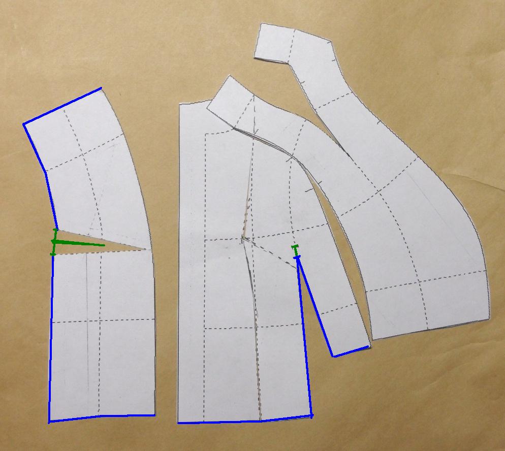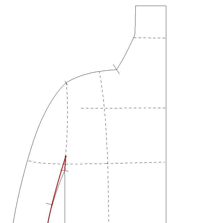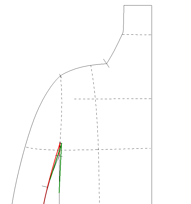 Milo Опубликовано 20 марта, 2014 Поделиться #132 Опубликовано 20 марта, 2014 (изменено) Изменение размера И так у нас выкройка на обхват груди – 96см, т.е. 48 размер.Но она подойдет и для стандартных соседних размеров: - на 46 будет свободнее- на 50 – плотнееТолько не забудьте проверить ширину по бедрам … и у 44р бывают бедра 100 и больше! Совет - перед раскроем сделайте пробник, хотя бы на половину фигуры. Уменьшение размера выкройки. Задача: - уменьшить 48р до 46р … т.е. на один размер.Так как выкройка у нас только на половину фигуры, то считаем так: 48см минус 46см … у нас лишних всего лишь 2см по ширине половины пальто, именно их нужно убрать … Лучше это сделать равномерно по основным вертикалям … а именно разрезав по бордовым линиям, сделать "нахлест" разрезанных деталей ( на меньше, чем 1см) ...На примерке (при недостаточном уменьшении размера) можно дополнительно:- забрать излишек в шов по спинке …- по полочке увеличить величину захода для застежки (лишнее потом срезать)При этом стойка будет прилегать ближе к шее. Но это не все.Рукав можно уменьшить на примерке пробника … заколоть излишек булавками с внешней стороны рукава по пунктирной линии (на плечевой детали рукава).И нужно будет еще поднять выше подрезы под проймой (покажу ниже). На оригинале пальто, вершины подрезов для втачивания бочка расположены низко … примерно 10 см вверх от л. талии … скорее всего это будет несколько сковывать свободу движения руками.В теме ранее показано много изделий дизайнера, и не всегда эти подрезы расположены так низко …При желании их можно сделать выше (даже до линии груди, но еще выше, наверное, не нужно) Поднимаем вершины подрезов , не нарушая конструкции. В данных лекалах поднимаю только вершину подреза спереди (как пример) … но желающие могут это сделать и сзади.Величину повышения взяла произвольную – примерно 3см (обозначила зеленым цветом).Значит, на 3см выше делаем подрез на полочке.Разрезаем бочок по линии перегиба под рукой (под мышкой) и раздвигаем на двойную величину ( 6см) со стороны полочки … так, как в этом примере подрез сзади не меняется, то деталь бочка как бы выпрямляется … Внутреннее окно проймы теперь будет таким (картинка для наглядности – это не лекало!!!) Изменено 20 марта, 2014 пользователем Milo Ссылка на сообщение Поделиться на другие сайты Поделиться