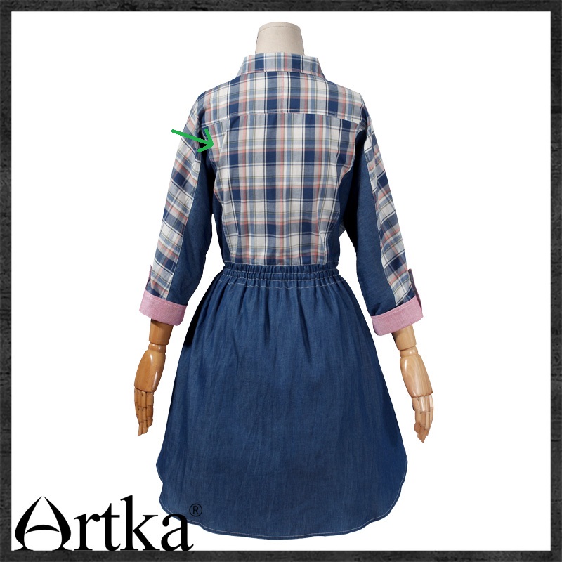 В клетчатом платье она сильнее косая (чем в однотонном) за счёт шнура, шнур(резинка) стянул талию, следовательно, ткань от папаротки поехала за натяжением шнура (резинки).