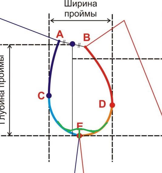 МамаТаня, я не пойму, для Вас принципиально нарисовать рукав именно в соответствии с этими формулами? Или просто нужен рукав под определенную пройму? Выложите чертеж проймы с проставленными размерами - ширина проймы, глубина и длины пройм по переду и спинке. Т.е. то, что есть в наличии, без подгонок под рукав. Попробуем адаптировать пройму под рукав шириной 40 см.