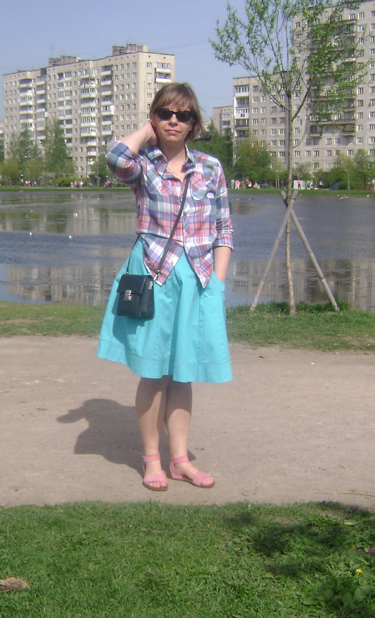 гюго Опубликовано 11 июня, 2014 Автор Поделиться #18 Опубликовано 11 июня, 2014 У меня рост 165, но при этом тенденция носить юбки-трапеции и пышные чуть за колено, что утяжеляет низ и режет ноги. Это классический силуэт "Нина, как ее увидел Шурик".Что меня спасает: майки как у Нины - вырез V-образный или лодочка, рукав 3/4 или поддернут до этой длины, сама майка заканчивается четко между линией талии и линией бедер. Выходит, что рукав и длина майки примерно на одном уровне, но так как руки в динамике, прогал между боком и рукавом то появляется, то исчезает, талия рисуется чуть выше, чем она есть на те самые потерянные каблучные сантиметры. Александринка, вставлю "свою Нину", пардон, что повторяюсь(притащила из своей темы). Там проблемка небольшая по ЛТ: юбка безпоясная и в зависимости от объемов, то сидит плотно на природной ЛТ, а то сползает на пару см ниже и делает меня грузнее, оттого там и рубашка навыпуск, прикрыть эту ерунду, но как следует обозначить талию не удалось, т.к. рубаха мужская, неприталенная. Вобщем, область ЛТ мне не очень-то нравится. Обувка умышленно светлая - тут я согласна, помогает. Если кому-нибудь будет нужно порисовать на мне - без проблем - завещаю себя Сезону, как Павлов - науке:) Ссылка на сообщение Поделиться на другие сайты Поделиться
