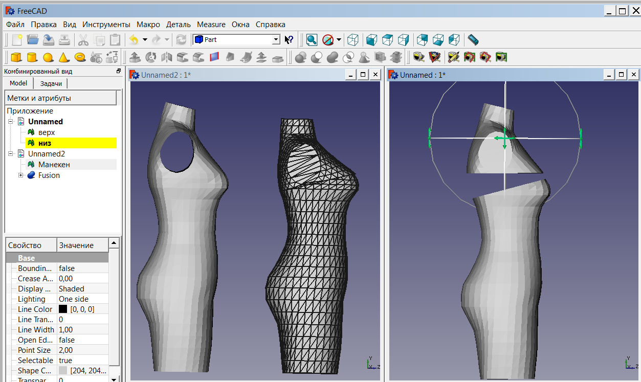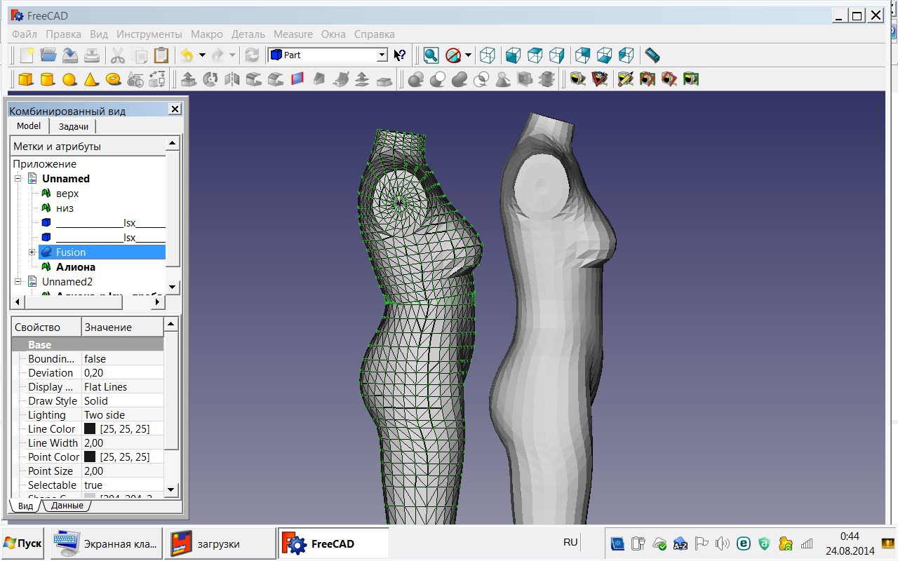 Думаю, что и во ФриКад тоже нельзя, но я делала цилиндр в разделе mech design и поэтому решила,что он уже является mesh-объектом. А вот манекен-то в формате obj , наверное, твёрдотелый ? Может надо его в формат stl перевести - это же сетка? Я-то чайник - всё путём тыка- пыка узнаю. Спасибо, Оля, что просветили - не знала, что грани - это полигоны. Всё равно не нашла команду для объединения сетей.Может, кто знает, где во ФриКад эта функция?