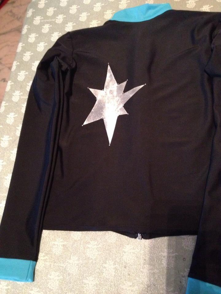 Юбка : двойная сетка с камнями черного цвета. На рукавах и голубых деталях камни аквамарин. На груди пришлось заложить маленькие вытачки. Впереди телесную сетку, которая вырез закрывает, по просьбе клиентки срез не обрабатывала. Но вроде бы она мне говорила, что после нескольких выступлений она начала закручиваться. Сама правда еще не видела.