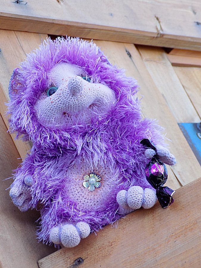 И рождественский мишутка из остатков пряжи , тоже тот еще сластена. Рождественским его Верунчик окрестила из -за цвета леденца и бантика.