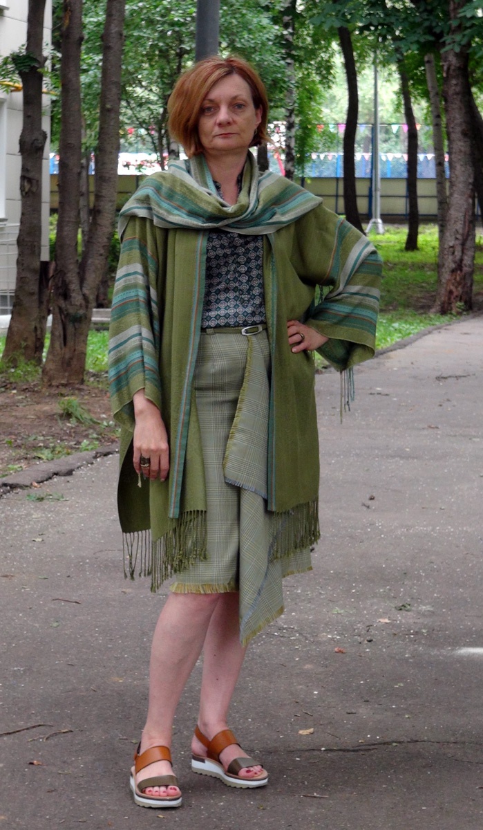 Всем заглянувшим - пламенный привет! Случился и на моей улице праздник- пошла за "хлебушком" и муж с фотоаппаратом подвернулся) Эта некофта получилась из двух старых вискозных палантинов. Однотонный стал некофтой, а полосатый разрезала вдоль на две части, одна пошла на рукава, вторая- на воротник-шарф. Внутри швы- бельевые.Конечно, с голыми ногами как-то странноватенько) , но это ж "за хлебушком"))) Весной носила ее поверх кожаной куртки, твидового жилета и даже стеганки) хорошо закрывает от ветра. Одна беда) мнется от одного взгляда -вискоза. Цвет волос у меня сейчас еще тот))) в отпуске постепенно выхожу из общества рыжих и плавно перетекаю к серо-русым .17 лет примазывалась к золотоголовым, но теперь захотела вернуться в естественное состояние.