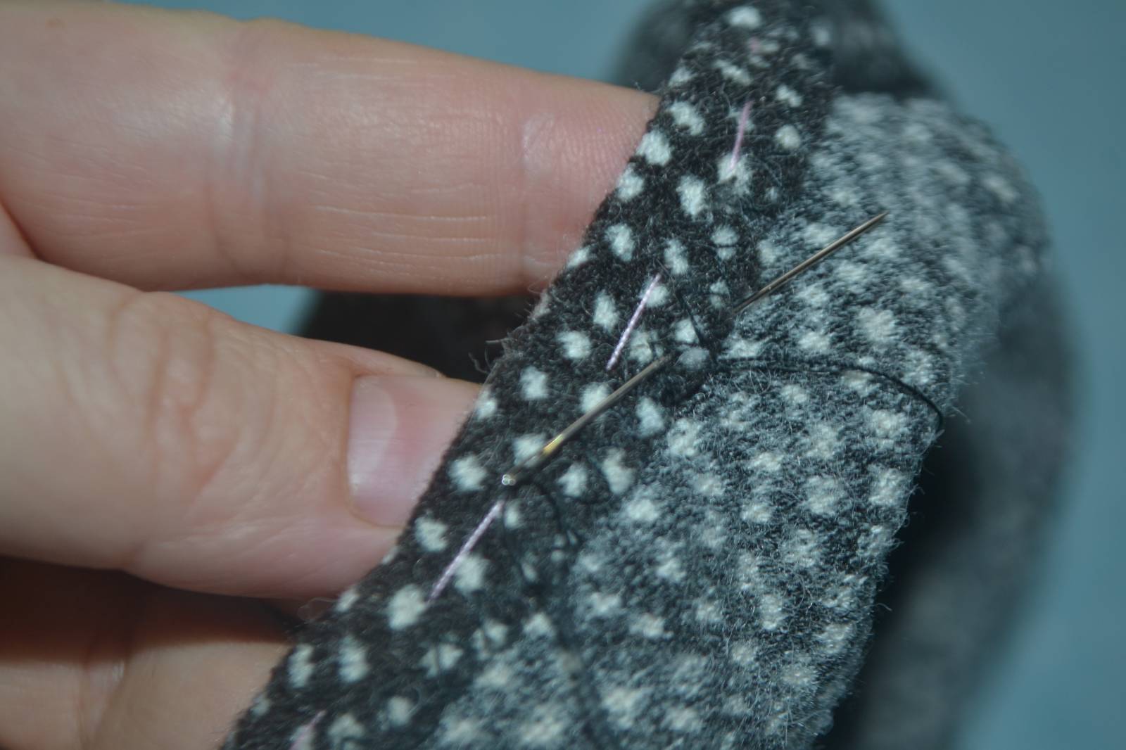 ПРимеряю полуфабрикат. Если длина стана и рукавов меня устраивает, то отгибаю на изнаночную сторону припуск на подгибку необходимой длины и подшиваю вручную. Шов получается эластичным, сам подгиб- без излишней толщины: