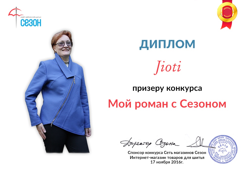 Светлана, Клуб любителей шитья вручает тебе диплом призёра конкурса с сертификатом от