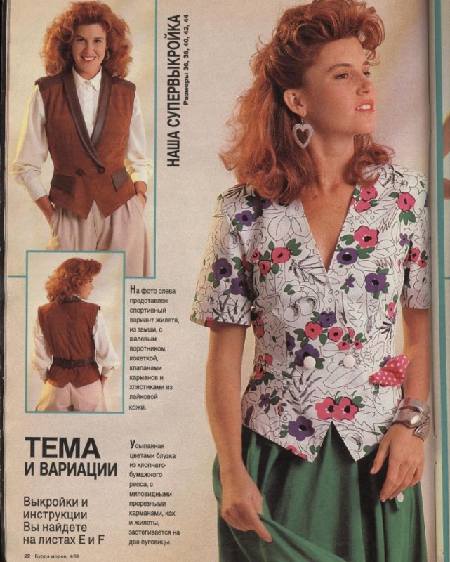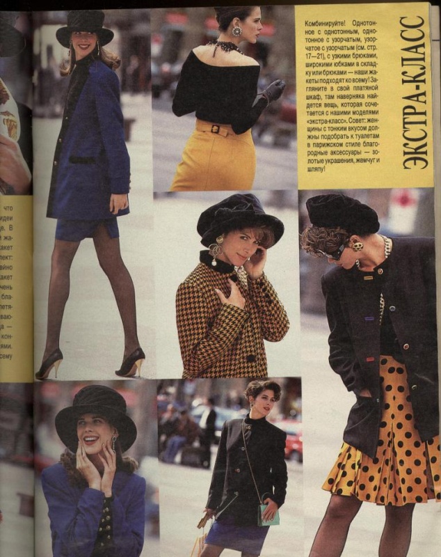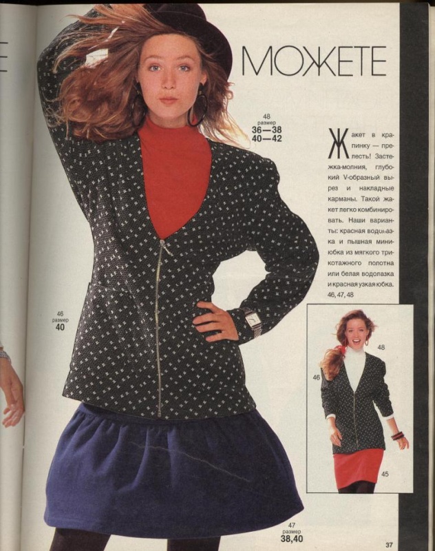 lititia Опубликовано 8 ноября, 2014 Поделиться #919 Опубликовано 8 ноября, 2014 Красотищща какая! А кто-то когда-то говорил (не помню где, вроде не здесь), что мода 90х была одной из самых некрасивых... Ничего подобного!! Мне вообще все нравится! может быть потому что ностальгия, столько воспоминаний связано с этими журналами? У меня тоже была бурда этих годов, вот эту страничку точно помню, - Долго облизывалаьс на этот блейзер, но так руки и не дошли. Практически ничего из этих журналов не сшила, уж не помню почему - может размер не умела уменьшать... Но засмотрела до дыр, все мечтала, что сошью со временем, а потом уже и поезд ушел... А сейчас опять хочу. Какие тогда были красивые летние платья! Уже позже шила платье из Бутика 98 года. Оно и тогда выглядело современным, и сейчас бы с удовольствием носила, если б нашла его. Шила не из купленной ткани, а распарывала старое платье - то ли бабушкино, то ли мамино. На нем еще были рюшики уже обработанные оверлоком, они оказались очень кстати, так готовыми и использовала. Вот оно. ** У меня сшилась рубашка мужу по выкройке 50х гг. Только она выглядит абсолютно современной. Поэтому я ее где-нибудь в другой теме покажу. ЮляОдесса-Сингапур-КалгариМой инстаграм Ссылка на сообщение Поделиться на другие сайты Поделиться