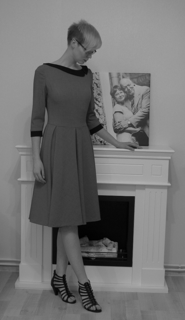 Sova Опубликовано 20 декабря, 2016 Автор Поделиться #389 Опубликовано 20 декабря, 2016 Простое скромное платье Моя младшая дочь захотела простое скромное платье, но чтобы оно было чуть-чуть "ретро".Мы с ней выбрали ткань благородного серого цвета и чёрную для отделки. Изюм: ассиметричный вырез и воротник, юбка-полусолнце с глубокими складками. Ссылка на сообщение Поделиться на другие сайты Поделиться