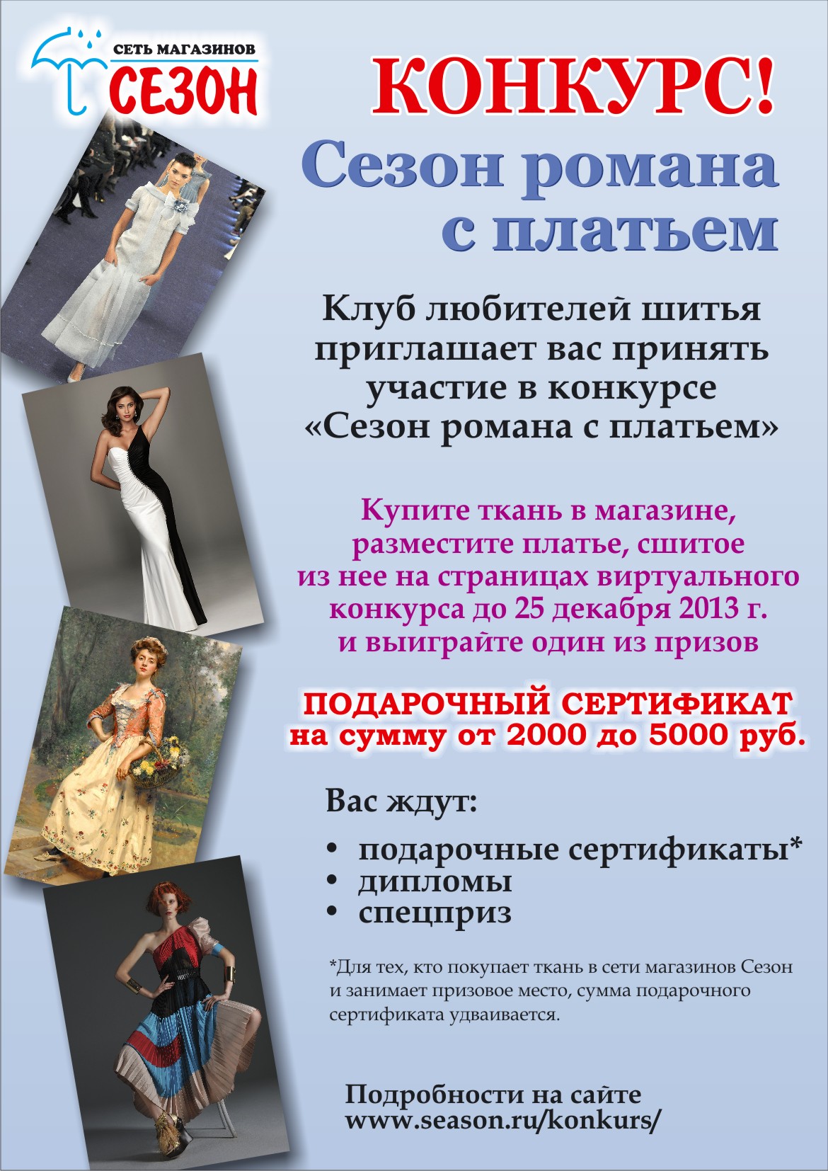 Zvezdopad Опубликовано 6 ноября, 2013 Поделиться #545 Опубликовано 6 ноября, 2013 Магазин в Люблино переехал! Но, это не значит, что магазинов у фирмы Сезон стало меньше:-)Открылся новый магазин Сезон по адресу Ленинском проспект, д. 39/1.В честь открытия магазина дарим скидку 25% всем покупателям!Срок действия акции с 25 октября по 15 ноября. Для того, чтобы воспользоваться этим предложением, надо распечатать купон и предъявить его при покупке товаров. КУПОН ЗДЕСЬ - жмите на ссылку, распечатывайте и шейте с удовольствием, а так же, участвуйте в конкурсе Сезон романа с платьем, который проходит на страницах форума! В каждом магазине Сезон висит такой плакатесли вы его увидели и купили ткань в магазине Сезон, у вас есть возможность выиграть главный приз конкурса - подарочный сертификат на покупку тканей в интернет-магазине Сезон на сумму 10 000 руб!Воспользуйтесь шансом - мечты имеют обыкновение сбываться! единственный способ жить хорошо - сразу уходить оттуда, где плохомой канал на YouTube, мой instagram, моя страница ВК Ссылка на сообщение Поделиться на другие сайты Поделиться