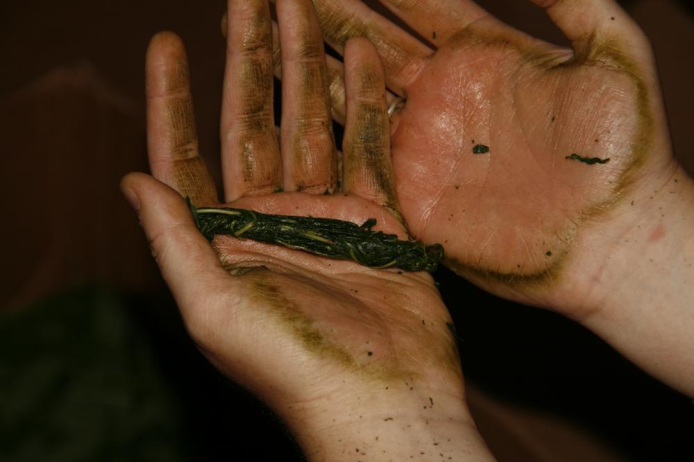 После подвяливания скрутить колбаски: небольшой пучок листьев катать между ладонями, пока не выделится сок. Занятие для сильных рук :) Ферментация начинается сразу же, поэтому общее время кручения колбасок должно быть не больше часа, лучше минут 40, иначе нижние будут передержаны, верхние недодержаны в итоге. Колбаски плотными рядами сложить в неокисляющуюся посуду и закрыть влажной тканью.