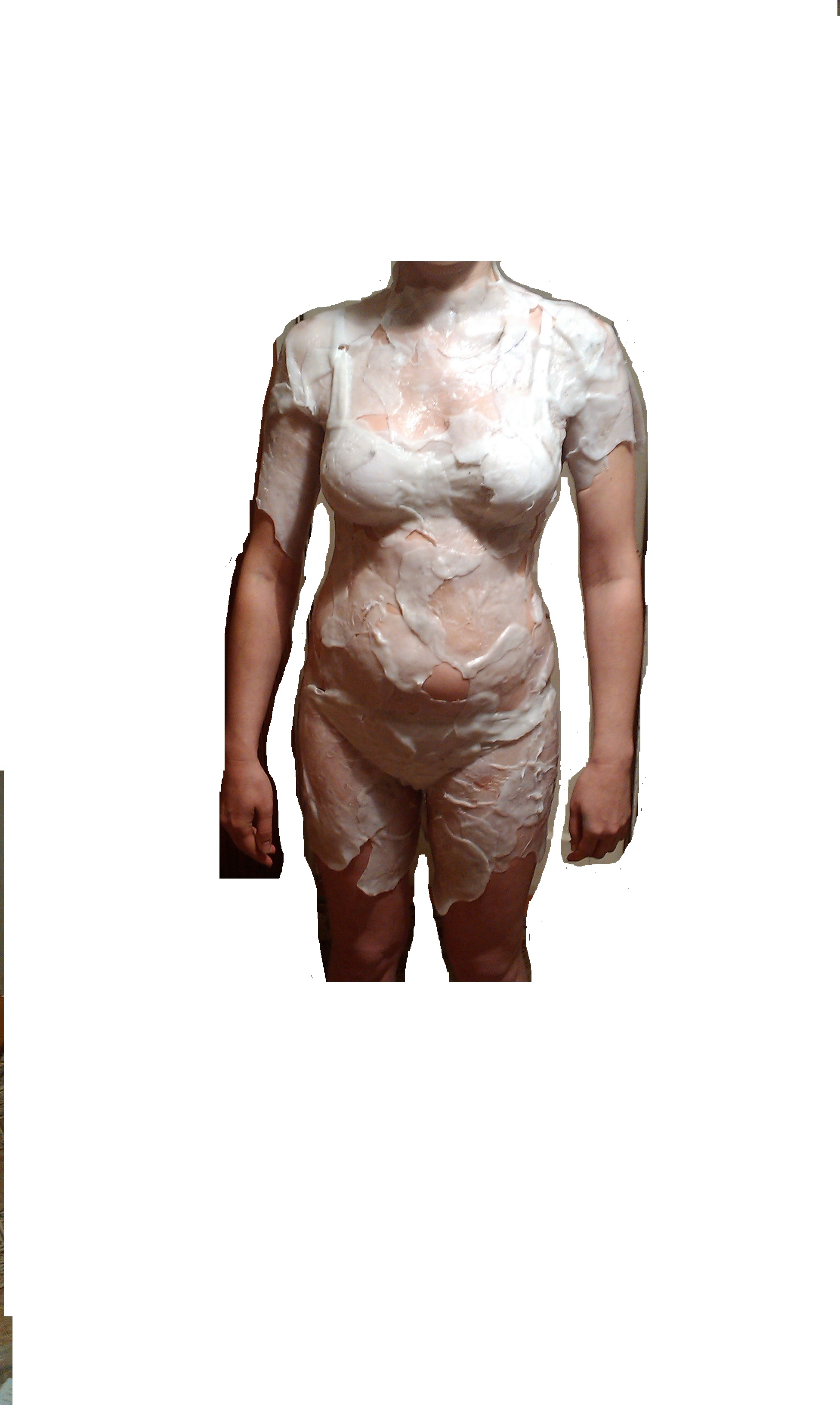 Налепливать нужно немного (чтобы не было лишних утолщений) внахлест. Важно чтобы пластина, которая уже налеплена на тело манекена, была еще теплая в тот момент, когда на нее будет лепиться еще одна. Так они прилипнут лучше. Но в некоторых участках тела сделать это невозможно: лепить я начинала со спины сверху – вниз, затем перед: снизу-вверх (грудная клетка в последнюю очередь, т.к. может стать плохо из-за недостатка воздуха, проверено на себе).
