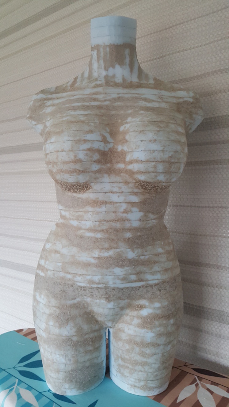 Шпаклевку из туалетной бумаги я таки сделала приемлемого для себя качества, покажу манекен на этапе окончания ее нанесения. Местами наносила не просто по швам, а областями, грешу, что при нарезании блинов муж не всегда держал лобзик строго под прямым углом к листу пенополистирола (это не так-то просто, лист гнется и играет на весу, упереть в него лобзик не выходит), ну и потом при подравнивании ножом тоже бывало, что лезвие уходит от траектории и срезает лишнее. Совершенно сгладить швы не удалось, щели всего в миллиметр, шпатлевка просто не держится.