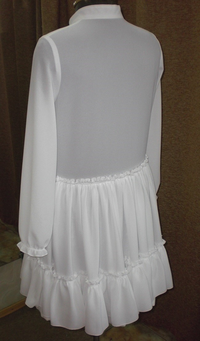 Платье-сводобного силуета,такая себе*распашонка*, отрезное по линии талии,юбка-это почти две полосы собранные до нужного объема,подгиб низа двойной,сверху настрочен волан.Подъюбник подкладочный батист.На юбках швы двойные.Рукав собран по низу на резиночку.