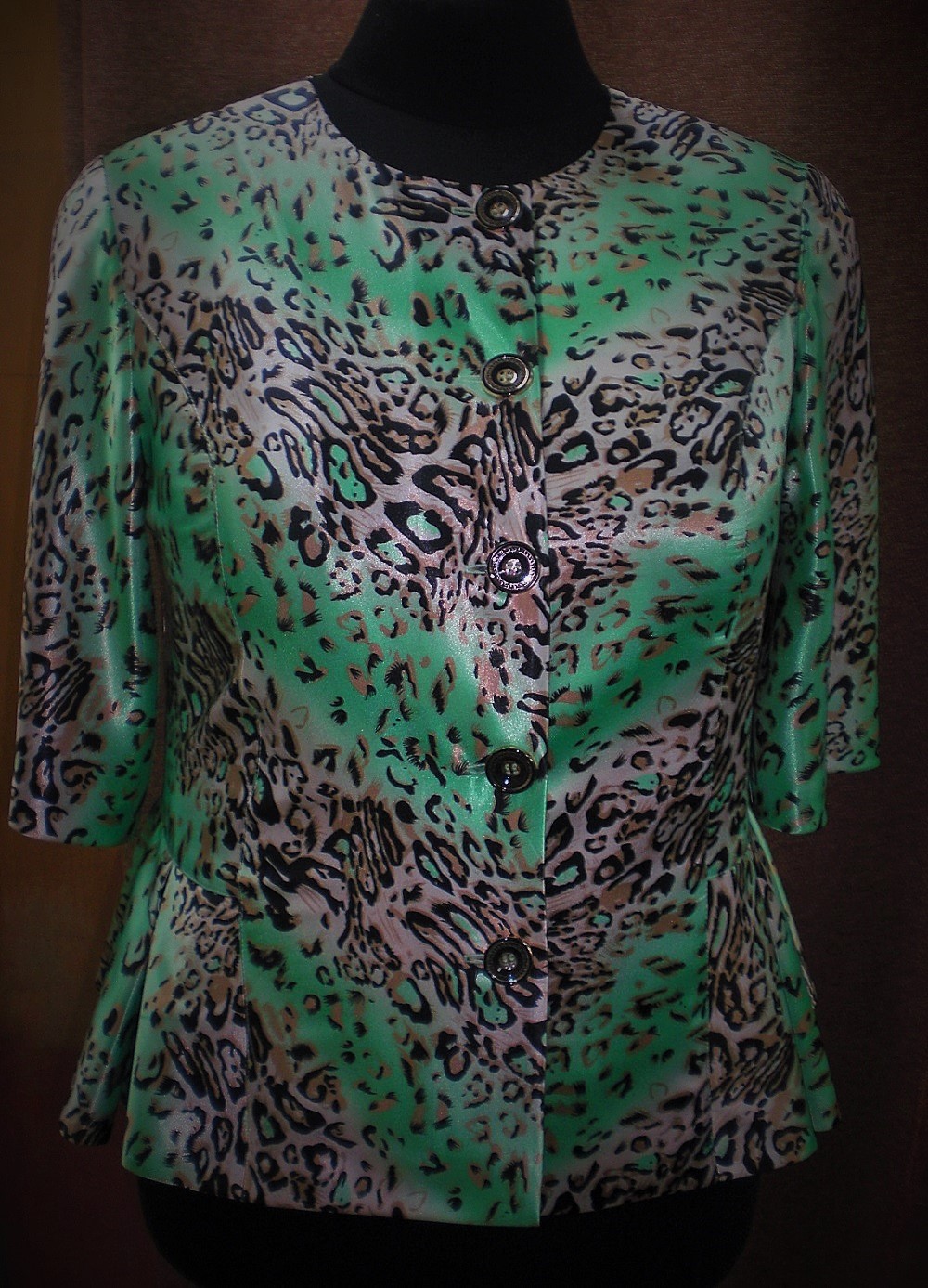Ну вот и я))))))))))Давно не появлялась,особо интересного показать нечего было.Зато сейчас покажу...Итак,костюм из натурального шелка(как мне сказала клиентка,хотя я сомневаюсь,но не проверяла)без подклады,баска двойная.Юбка к нему на подкладе прямого силуэта.Когда увидела ткань ничего кроме пеньюара не мысль не приходило....а тут костюм,венский рельеф,баска,рукав фонарик-короче,сказать что я была в шоке-это ничего не сказать.При этом он должен быть в облипку,само собой баска требует...Я стараюсь никогда не переубеждать клиента(чаще советую или пытаюсь объяснить вид не выходе,но тут я отговаривала-не послушали)Ткань с рисунком направленным в одну сторону,под 45градусов.При крое чтоб полосы выложились и совпали,левая сторона жакета-скроена по правильному направлению долевой,правая сторона до центра спинки-вся по косой.Повезло село не плохо,хотя я сомневалась.Юбка скроена по косой.Рукав тоже по косой.На примерке прошло все относительно хорошо,изменений особых не было,но все пестрело))))Решили убрать фонарик на рукаве и сделать рукав с незначительной посадкой,уже лучше...но когда приложив пуговицы,при этом одет поясок черный(Планируют носить под пояс)еще и бант планировался,меня просто подкосило(((Явный перебор.От банта отговорила,да и незаметно его там))).Сегодня забрали костюм,при этом согласившись со мной,что я была права на счет фасона и деталей,.Человек видел красивую ткань,но получив вещь и остался разочарованным итогом-к исполнению претензий нет,но осадок остался....Хотя если носить под черную юбочку совсем даже не плохо получается,а к юбке подобрать блузу однотонную.Но вместе их сдружить никак нельзя((((Мораль сей басни такова_не нужно слепо идти на поводу у клиентов,пытаться представить результат и донести итог.Иначе как-то не радостно!