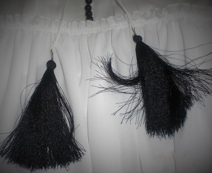 На полочке имитация застежки на навесные петли,петли настоящие)))только там застрочено.По стойке есть шнурок-завязка на ней есть петельки,за них будут крепиться кисточки черного цвета из шелковых нитей.Кисточки клиентка делала сама,она тоже натура творческая).Завтра должна приехать за платьем,привезти кисти.,обещала фотки на фигуре.