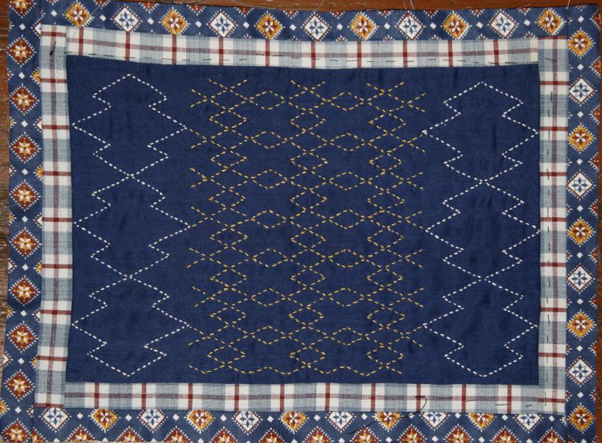 Точно будет сочетание цвета ткани индиго и белых ниток + традиционный патерн + строгое соблюдение длины и расстояния стежков, они не должны перекрещиваться.