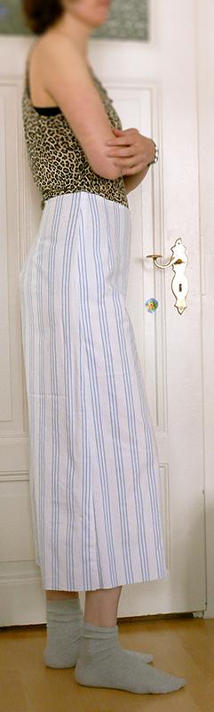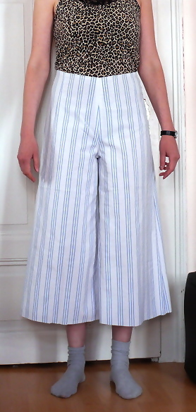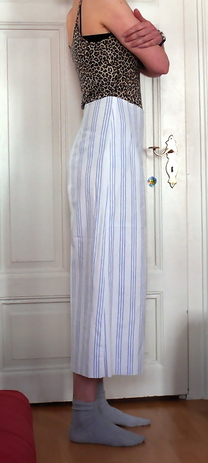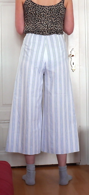 camille Опубликовано 23 апреля, 2015 Поделиться #164 Опубликовано 23 апреля, 2015 Девочки, я попробовала на бумаге уже три варианта. Хотела сшить по выкройке кюлотов построенных от юбки, со встречными складками спереди, но передумала. Ткань диктует свое. Вчера, решила сделать еще построение от выкройки свободных брюк с прямыми шатнинами, т.е. будут "брючные" кюлоты, а не "юбочные":) Спрямила боковые и внутр. швы, постаралась равномерно раздвинуть расклешение . Два расклешения по детали штанины и одно боковое, каждое не больше трех см.Бант опустила сзади на три, и плавно перешла спереди на два см (у меня наклоненный торс, т.е. прогиб, изгиб или как его там...)Показываю пробник из простынки. Мне кажется ничего так, можно брать за основу. Как вам длина? На фото увидела, что надо чуток прибавитъ в шаге и в верхней части бедер чуть-чуть посвободнее.И, по поводу вопроса отставания штанины вбок- нога болтается как в колоколе. По-моему, все ок. Ссылка на сообщение Поделиться на другие сайты Поделиться