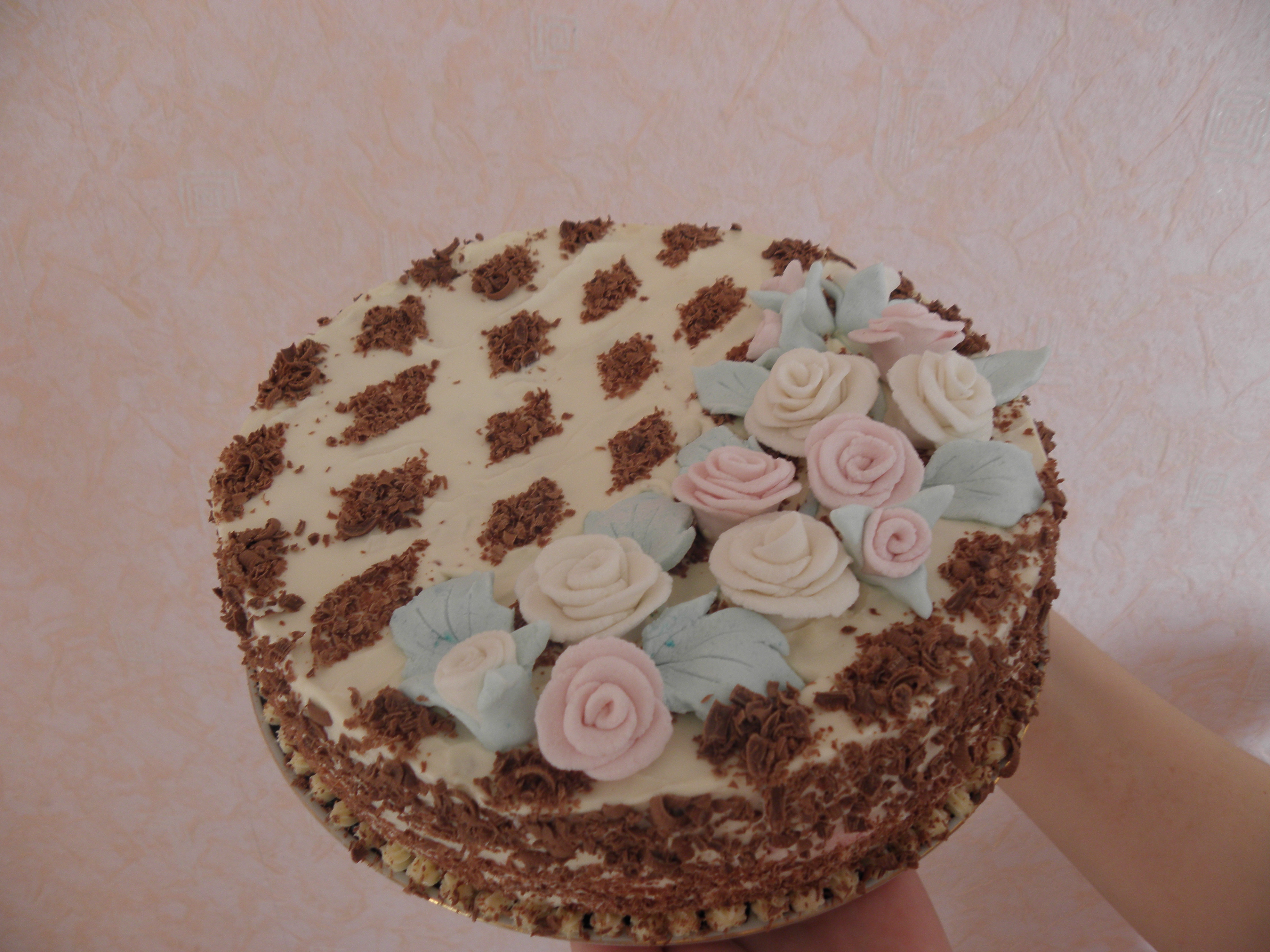 Анастасия Д. Опубликовано 30 сентября, 2011 Поделиться #306 Опубликовано 30 сентября, 2011 Для теста: 4 яйца, 120 гр. сахара, 80 гр. муки, 1 ч.л. разрыхлителя, 1 ст.л. какао-порошка, 100 гр. орехов.Для начинки: 600 гр. замороженной вишни без косточек, 2 ст.л. крахмала, 12 гр. желатина, 500 мл. сливок, 70 гр. сахарной пудры, шоколад для украшения. 1. Духовку нагреть до 180 градусов. Яйца хорошо взбить с 120 гр. сахара. Во взбитую массу просеять муку смешанную с разрыхлителем и какао. Аккуратно перемешать. Тесто выложить на смазанную маслом дно разъемной формы диаметром 26 см и выпекать 25-30 минут. Готовый бисквит вынуть из формы и остудить.2. Бисквит разрезать попалам по горизонтали. вокруг одной половны поставить бортик формы, другую половину коржа мелко искрошить. Вишни вскипятить с добавлением сахара (по вкусу).Крахмал развести с небольшим колличеством воды и загустить им вишни. Выложить начинку на корж.3. Желатин замочить. 400 мл. сливок взбить с сахарной пудрой. Желатин отжать и ввести в сливки. Добавить бисквитную крошку и выложить полученную массу на вишневую начинку. Торт поставить на 2 часа в холодильник. Оставшиеся сливки взбить с 30 гр. сахарной пудрой и смазать им торт. Украсить шоколадом. Ну и мое желание было сделать розы и тоже украсить ими торт) Украшение - это идея каждого, кому как понравиться)Здесь такой же торт, но украшен по другому))) Будущее принадлежит тем, кто верит в красоту своей мечты) Ссылка на сообщение Поделиться на другие сайты Поделиться