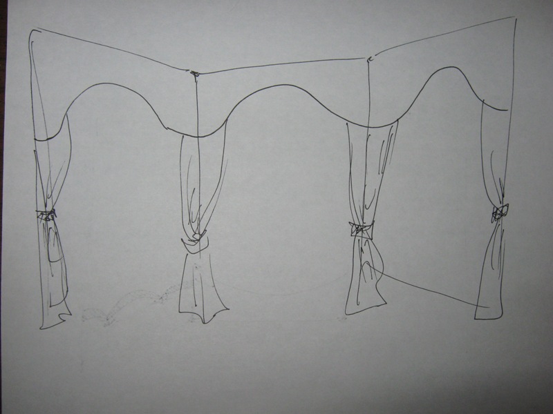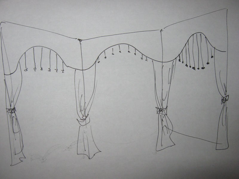 Надо сшить типа шторок на это окно. Ничего кроме обычного ламбрекена и двух крайних длинных шторок в голову не приходит. Раздвигать и задвигать шторы не требуется, просто нужно для окантовки и законченности окна.