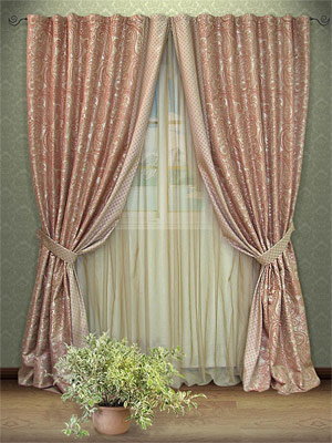 2. треугольный ламбрикен угол вниз по центру, с кисточкой , а по краю ламб. можно отделать однотонной тканью