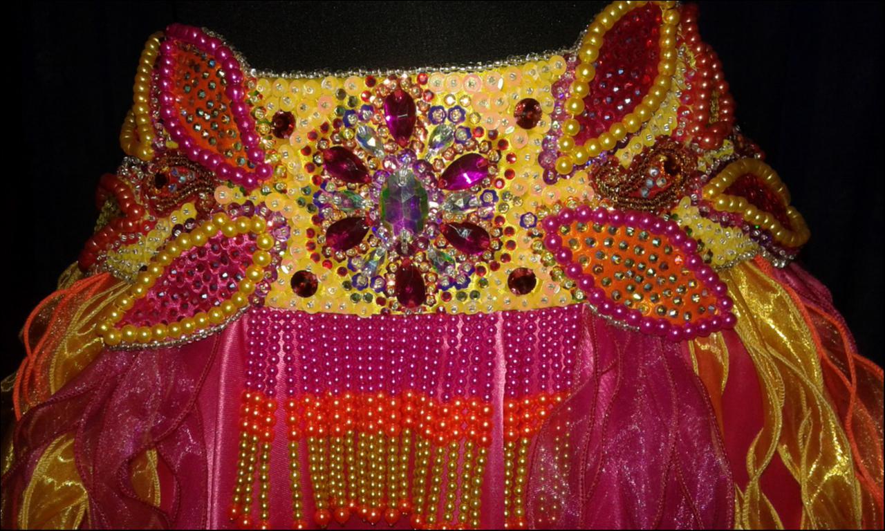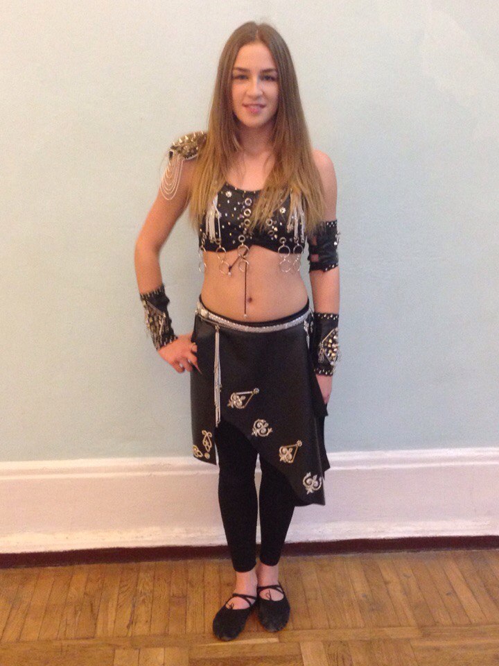 toha-san Опубликовано 20 декабря, 2015 Автор Поделиться #59 Опубликовано 20 декабря, 2015 Для рок-беллиданс - костюм в стиле глэм-рок. Н а конкурсе ребенка выловила, быстро отсняла. Это вторая хозяйка костюма - шился он для жгучей брюнетки и был под нее заточен. К тому же она одевала брючки со вставками из хорошего кожзама . С лосинами он смотрится не гуд. То есть вообще не смотрится. Только увидела застежка на юбочке другая, там была целам система переплетенных цепочек, застежек, они каскадом свисали пр боку. Жаль, конечно... Юбочка - из тонкой кожи, расшита металлическими элементами. Внимательно смотрела эполет - вспомнила, что в отделке использовала и зубья серебряной молнии. Ссылка на сообщение Поделиться на другие сайты Поделиться