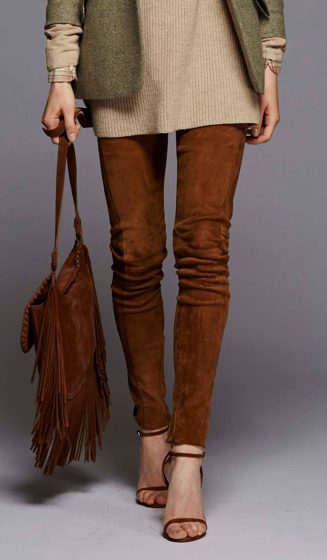 гюго Опубликовано 28 ноября, 2017 Поделиться #2480 Опубликовано 28 ноября, 2017 В полях иначе, несколько «обнаженный» эффект. Бывают ещё чёрные, но они почти не отличаются на вид от трикотажных. И есть зелёные.Что думаете?К первой подборке про замшу и 70-е: увы, со мной прерии и ковбои не монтируются... Я думаю, что сейчас леггинсы, (городские, не спорт) - как вид в целом, и в замше, в частности для взрослых теть (не юных ланей) актуальны в составе монохромного, а возможно даже, и монотканевого (из одинаковой ткани) комплекта, т.е. костюмом (как брючный) - см. картинку ниже - не замша, а вот оттенок как раз в сторону "твоих" картинок; если представить эту тетю без платья или ту, что рядом в синих - то получится тетя в трениках, образца 70-х, которой не хватает для завершенности образа только майки-алкоголички на картинках с полей девушки скомплектовали их с верхами по принципу джеггинсов - с "иными" верхамиподозреваю, что исключением, при котором это может сработать, как раз и будут классические джинсовые и кожаные, они воспринимаются самостоятельными единицами и могут так комплектоваться Думаю, что в удачном варианте (это - первая картинка, с подиума) секрет успеха - в почти монохроме - это раз;- в сочетании фактур - трикотаж и мех для замши - самое оно - это два- оттенок ассоциируется не с нюдом, а с охотой; - это три...темные вообще воспринимаются не так анатомично, как светлые либо яркие (оптика:) И в контексте этих же рассуждений хочу ответить Ядвиге на реплику про "они слишком круто выглядят": такой эффект получается, когда леггинсы "солируют", например, те же кожаные. В случае комплекта, который я описала выше , т.е. монохром и/или моноткань (см. картинки) - они воспринимаются, просто как часть комплекта. На их месте могли бы быть брюки или колготки и вызывающим казалось бы, напротив, их отсутствие:) + картинка про забавные штрипки:) Ссылка на сообщение Поделиться на другие сайты Поделиться