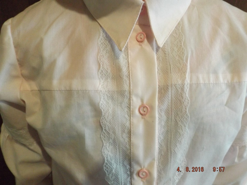 МамаТаня Опубликовано 8 августа, 2016 Автор Поделиться #384 Опубликовано 8 августа, 2016 Белая блузка из креп-атласа, очень нежного и цеплючего, затяжки от проколов булавкой, когда пробила петли пришлось удалять следы от гребенки... На знала какой формы сделать воротник для такого галстука, круглый или острый, когда прицепила его к горловине, вопрос отпал))), воротник любой формы был не виден под бантом))), поэтому делала как мне удобнее. У Насти покатые плечи, и чтобы сформировать красивый окат, сдела подокатник из органзы. Моя тема. Ссылка на сообщение Поделиться на другие сайты Поделиться