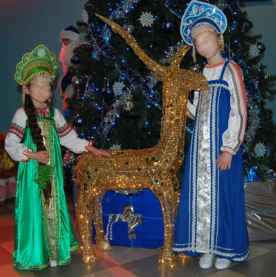 В этом году бабаушка привезла девочкам кокошники, поэтому вариантов с новогодним костюмом было немного. Ну и речь даже не шла, чтобы что-то непонятное сшить - только косоклинный.