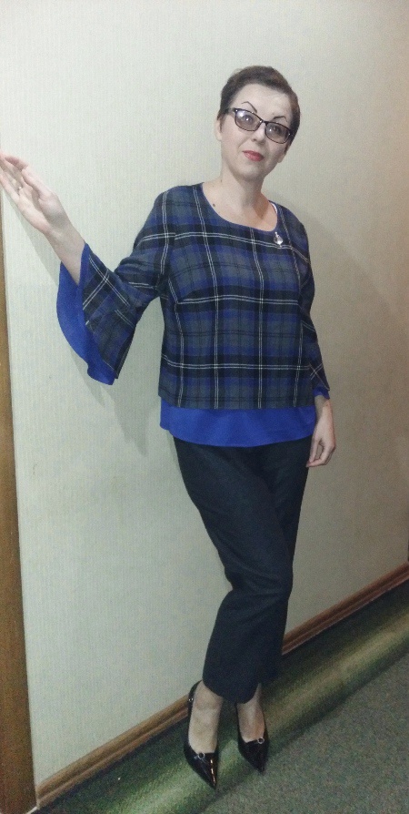 varfalameev73 Опубликовано 13 декабря, 2017 Автор Поделиться #619 Опубликовано 13 декабря, 2017 (изменено) всех приветствую)) принесла показать и рассказать))) была у меня ткань в клетку... и всем тут на форуме я вынесла мозг, какую юбку из этой ткани сшить)) разные варианты рассматривались... потом были танцы с бубнами вокруг юбки, вокруг складок и наконец-то юбка была сшита... и одета ровно 2 раза,чтобы я поняла, что это не моя юбка... несколько раз порывалась все распороть и оставить фэн-шуиться... но как вспоминала танцы с бубнами становилось жалко и юбки и своей работы... так и висела она в шкафу, света белого не видела... а потом я увидела в 10 номере журнала Бурда модель 111В и поняла как можно дать юбке вторую жизнь)))) модель в журнале двухслойная... я тоже ее видела двухслойной, но из тканей компаньонов... и вот с кусочком ткани от юбки я пошла по магазинам искать компаньона... и нашла блузочную вискозу точно такого же цвета как сине-фиолетовые квадраты на юбке)) и вот та=да=да=дам!!! блузка готова)) по горловине выпустила кантик, очень мне его хотелось)) вертикальные швы воланов выполнила запошивочным швом,чтобы ничего не было видно лишнего ни с лица, ни с изнанки... низы воланов и основных деталей выполнила тонкой подгибкой... и нашлась брошечка-балеринка) и брошка) Изменено 13 декабря, 2017 пользователем varfalameev73 моя тема Ссылка на сообщение Поделиться на другие сайты Поделиться