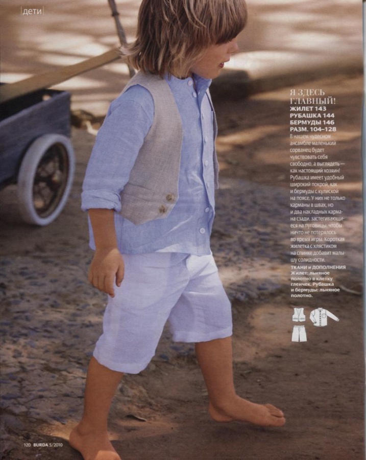 Еще летний костюмчик, теперь для мальчика в Альбоме schmidti, она пишет: "Пока нет собственных детей,тренируюсь на подружкиных. Костюм сшит (или перешит) из женской блузки и подростковых брюк. Выкройка из Бурды"