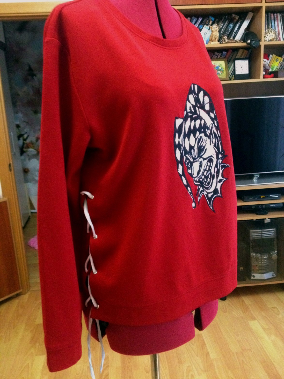 Выражаю огромную благодарность участнице Черный зонт! Увидела в ее альбоме эту вышивку, https://club.season.ru/index.php?s=&sho...t&p=1114543, и заболела (в творческом смысле)) Но мир не без добрых людей, Черный зонт откликнулась, и проделала большую работу, сначала в поисках ткани, затем работе с вышивкой и финальной отправке по почте! Было очень приятно получить посылочку из далекого Новосибирска). Ткань плотный трикотаж, сочный цвет и смеющийся Джокер, максимум удовольствия). Сшила дочке к Новому году джемпер, по бокам шнуровка, помучилась с люверсами, в остальном без сложностей, теперь это ее любимая вещь, к счастью стирку переносит хорошо.