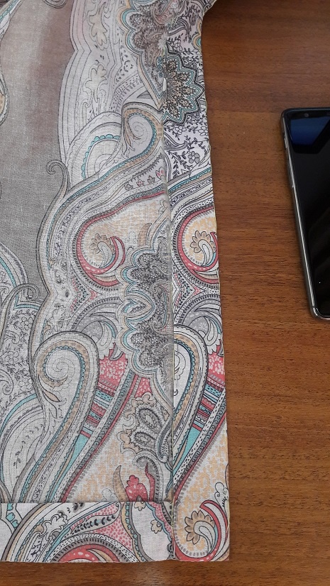 3. В случае, если у вас ткань как и у меня - с узорами, после заметывания планки и низа проверяем совмещение рисунка - очень важный момент. "Застегиваем" изделие - все ровно, рисунок совпал, можно отстрачивать. Даже если рисунка нет, все равно застегиваем, чтобы проверить длину бортов, чтобы не было смещения и разной длины - изделие потом может косить, если мы будем корректировать края борта со стороны воротника.