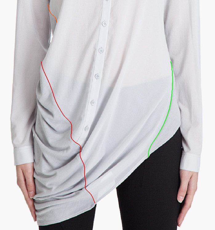 Хочу проверить , правильно ли поняла - низ блузки будут составлять сумма 2-х отрезков АВ? Слева, сбоку драпировка никак не фиксируется, она распределяется по линии бедра благодаря правильно выбранному наклону срезов DB?