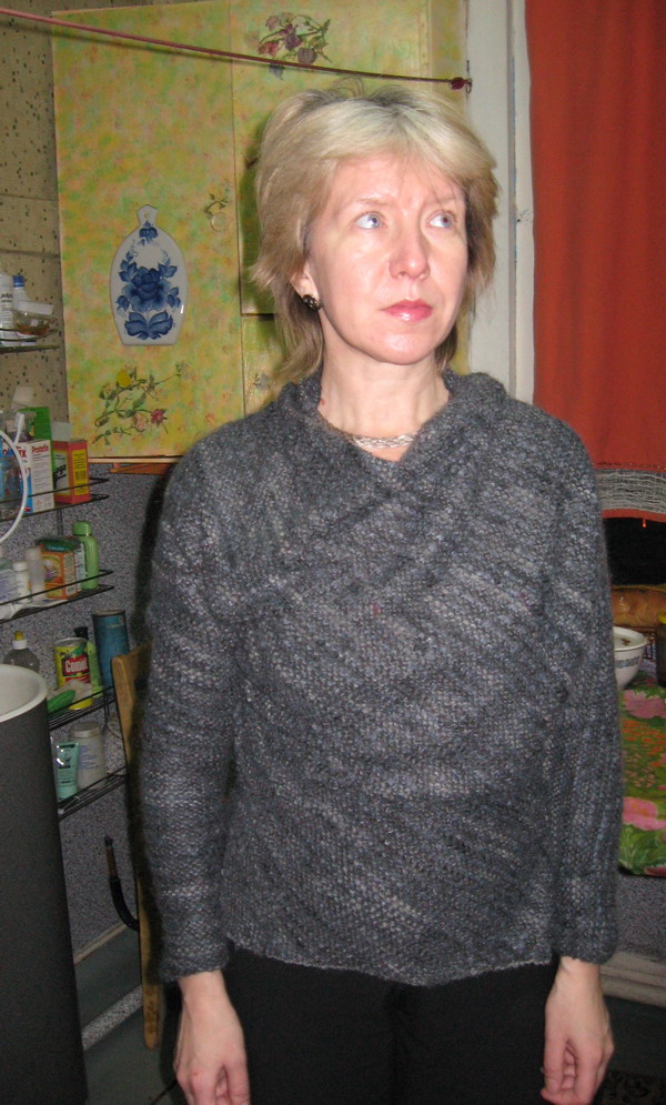 Наконец я его сшила! - перекрученный джемперочек - из обретенного в закромах отреза фактурного мохера (кажется). Правда, пришлось сделать со швом на спине - не укладывалась по длине. Выкройку, любезно выложенную Александринкой укоротила примерно на 12 см. На удивление комфортная вещь! Спасибо - Лемур, Мане, Александринке и всем вдохновителям! Вот здесь фактурка поближе видна