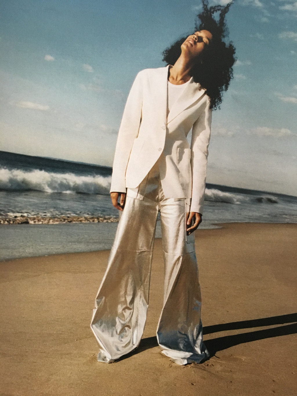 Сегодня пришел свежий журнал WSJ, они даже на сайте картинки еще не продублировали (снимала на телефон), так нашла в нем Олины штаны :-) Белый металлик, от Miu Miu.