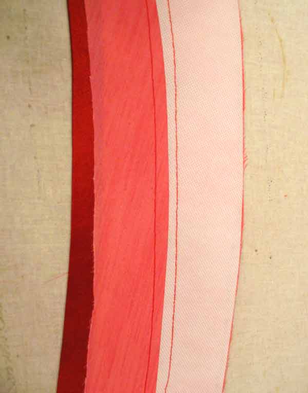по верхнему срезу красного фрагмента радуги(там где нет припуска на шов) с изнаночной стороны по всему контуру в край приклееваем паутинку на бумаге -полосу 1-1,5см, снимаем бумагу,и парогенератором же приклеиваем розовый и красный участок по контуру встык.Верхняя часть красного фрагмента приклеевается к припуску на шов розового фрагмента радуги. Когда полосы остынут, настрачиваем на стык(закрывая его) косую бейку другого оттенка красного, чтобы получить плавный переход цвета, можно настрочить несколько рядов бейки,для более реалистичного перехода цвета по радуге. Аналогично наклеиваем каждый последующий слой радуги и закрываем стык косой бейкой .