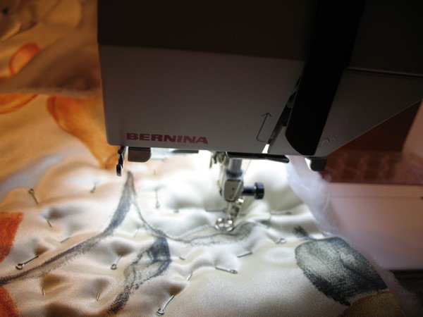 удобно стегать по рисунку уже самой ткани(если таковой присутствует), а дальше при помощи вышивальной лапки обстрачивается каждый фрагмент, если позволите,я правда не знаю где лучше,в какой теме, я могу показать фотки по этой стежки на примере другого покрывала и подушек