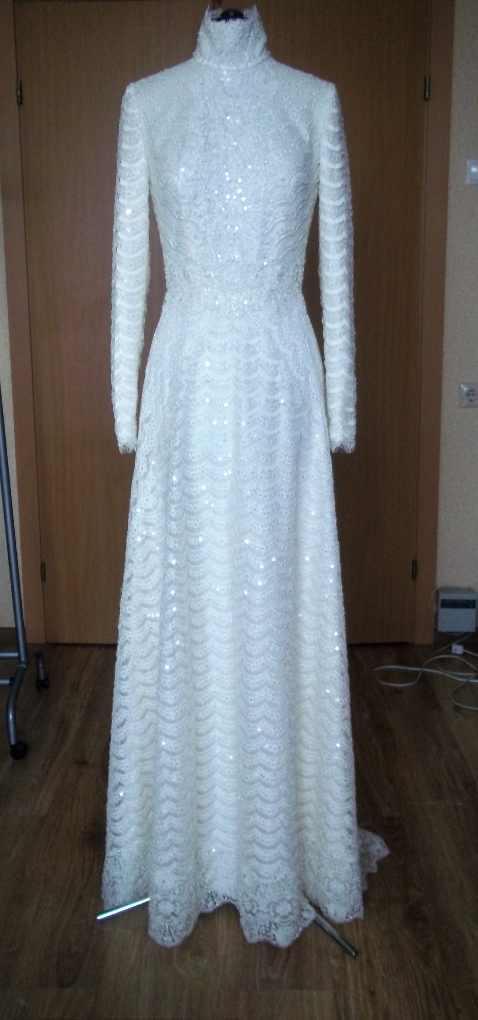 Речь шла о кружевном (расшитом бисером,пайетками) платье и кейпе с капюшоном. Кейп хотели сначала кружевной, потом думали из органзы. Уговорила на сетку (воздушная, не мнется)
