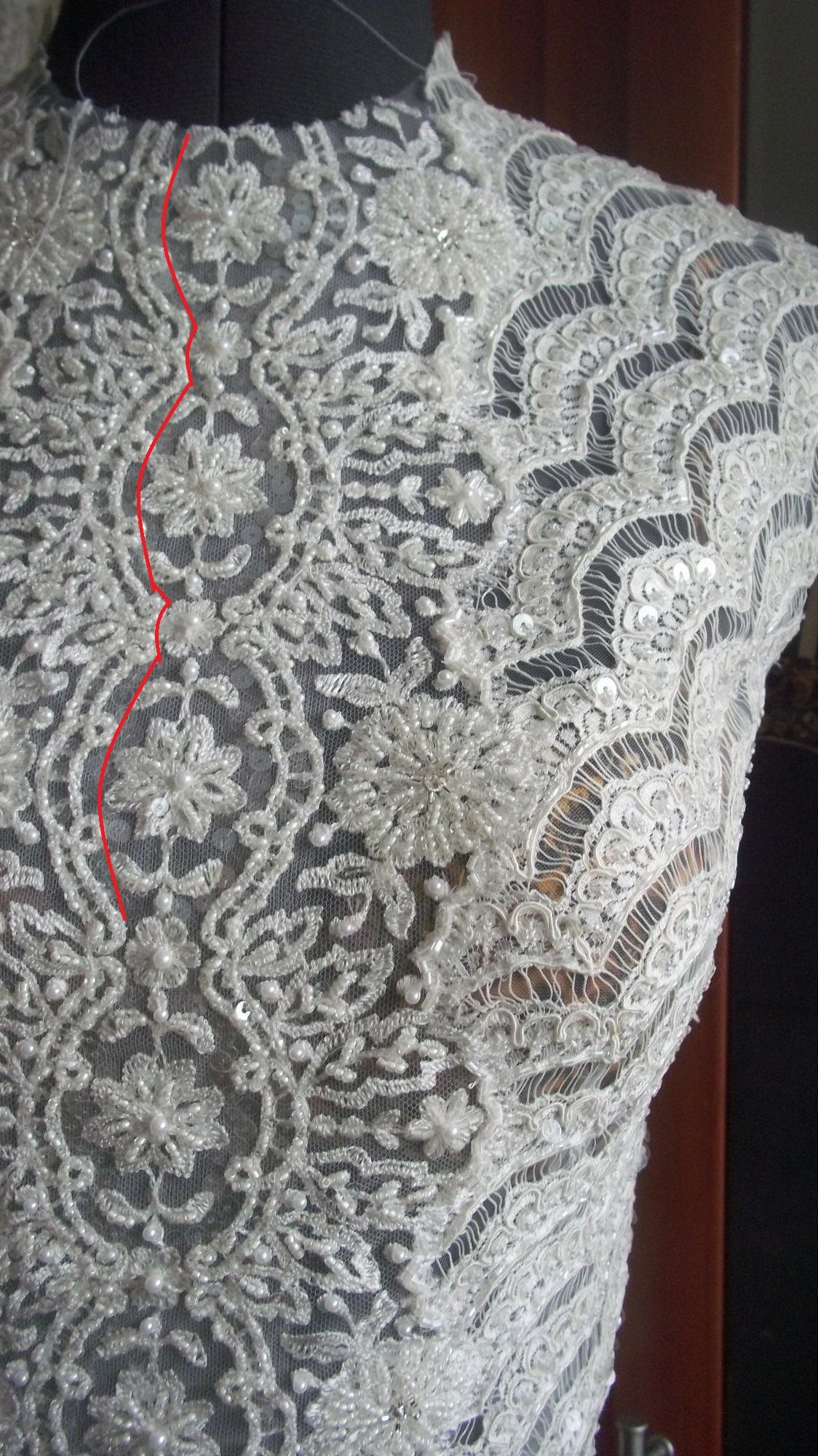 Волшебницы, нужна ваша помощь, подсказка, не могу понять как кроить сетку лиф в этом платье, нет плечевых швов(выкроен целым), только сзади разрез и пуговицы. Рукава я так поняла соединили там где начинается декор кружевом, этим и закрыли швы.